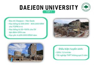 Đại học Daejeon university là một trong những trường được chứng nhận ưu tiên visa thẳng. Trường cung cấp đa dạng ngành học và là điểm đến ưa thích của sinh viên quốc tế. Nếu bạn đang có ý định đi du học Hàn Quốc thì đừng bỏ lỡ bài viết về đại học Daejeon university sau đây nhé!