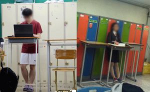 Bạn có thể dễ dàng tìm thấy những chiếc bàn học đứng như thế này ở các trường cấp 3 Hàn Quốc. Làm sao để vừa đứng vừa học nhỉ?