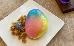Phần bên ngoài của món tráng miệng được phủ một lớp sô cô la bảy sắc cầu vồng, và bên trong là một lớp mousse sữa chua tươi mát làm từ quả mâm xôi và xoài.