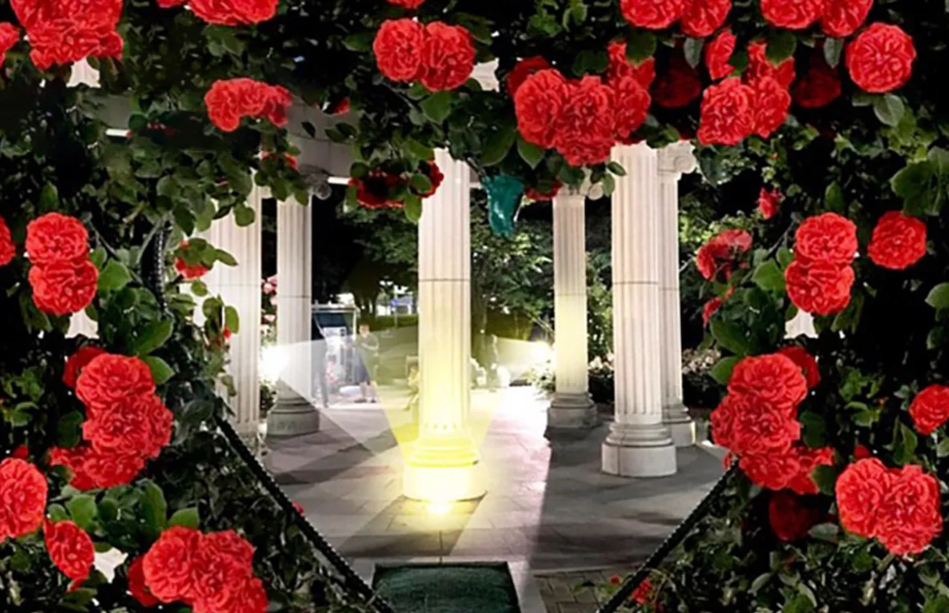 Trong vườn hoa hồng có đường đi dạo quanh hồ, và còn được trang trí vòi phun nước rất lãng mạn, thích hợp để vừa đi dạo vừa ngắm cảnh một cách yên tĩnh và thoải mái.