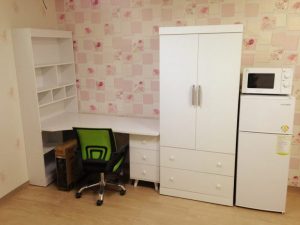 Ký túc xá bao gồm các phòng đôi đã được trang bị nội thất, có mạng, giường đôi, đệm, bàn, ghế và tủ đựng đồ.